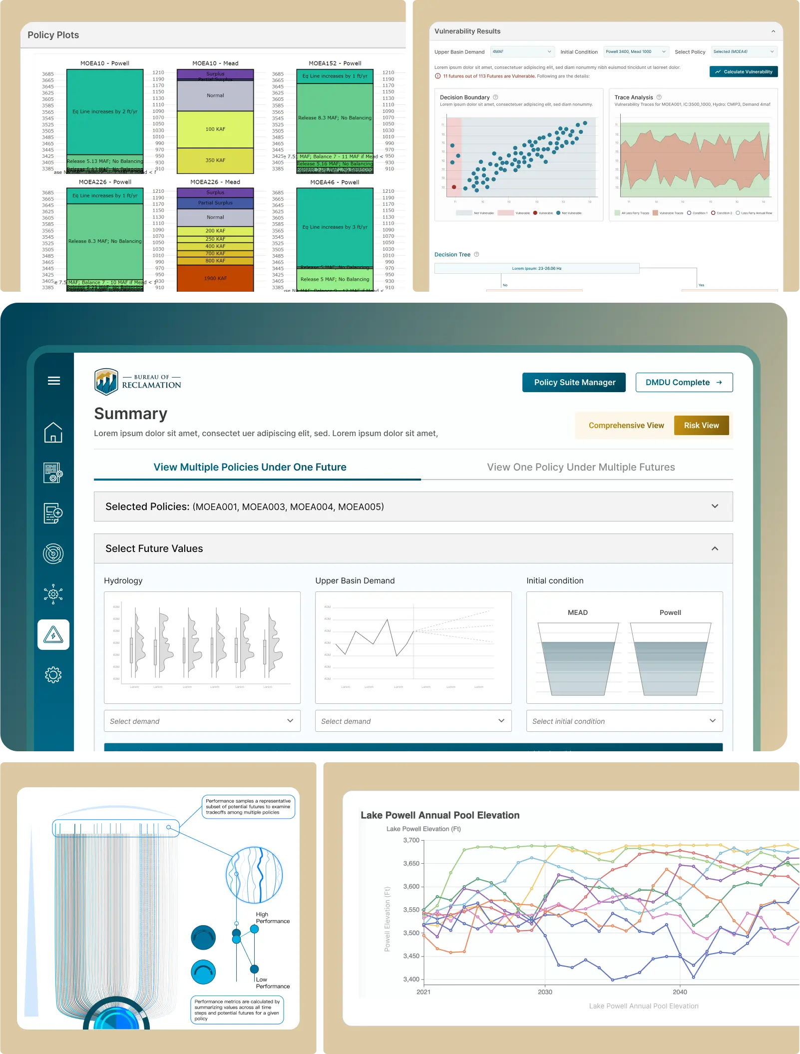The final system provided the Bureau with a future-ready water policy simulator, capable of testing dozens of hydrology futures and shortage frameworks in minutes. Researchers gained efficiency through structured workflows, while policy stakeholders benefited from intuitive visualizations and guided policy creation. The platform reduced interpretation errors, improved communication across teams, and gave decision-makers confidence in planning for 2055 and beyond.