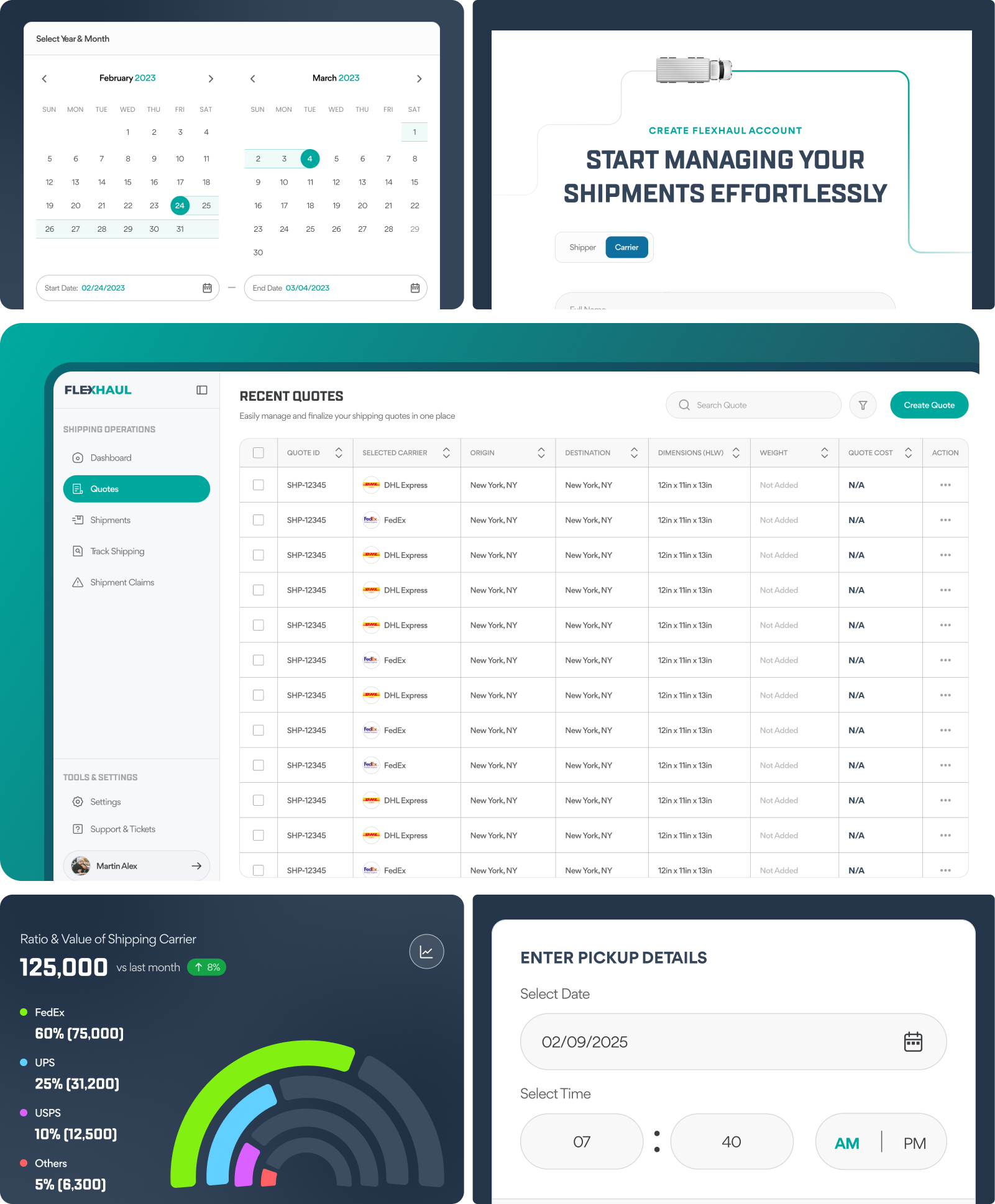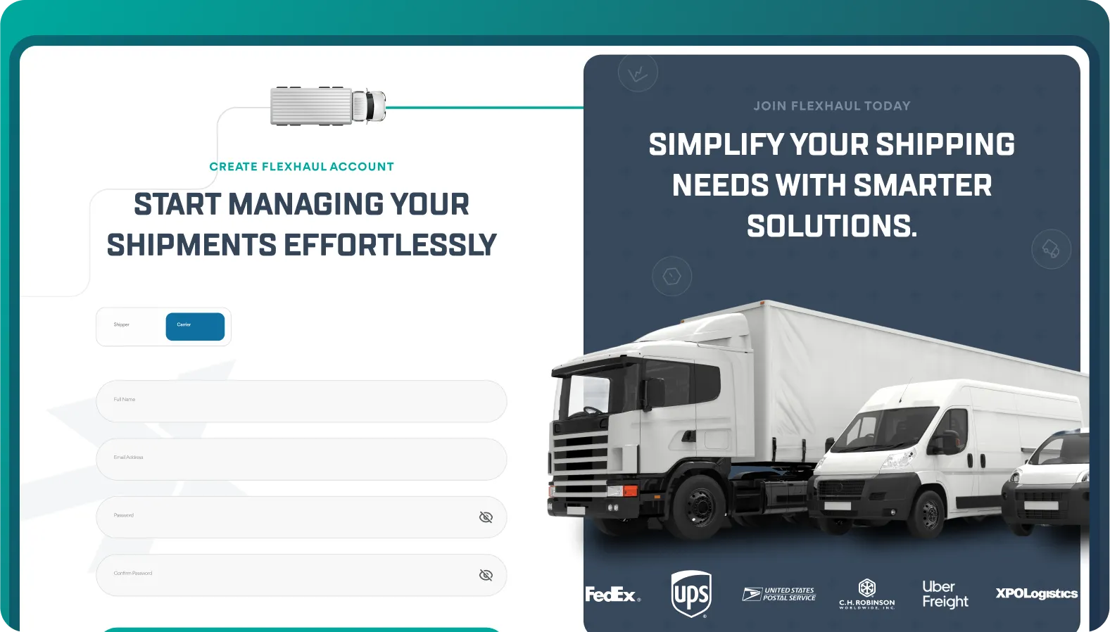 "Working with the design team was a game-changer for Flexhaul. They took an incredibly complex shipping process and made it feel simple, intuitive, and even enjoyable for our users. The prototypes gave us clarity early on, and the new brand identity instantly built trust with our audience. We now have a platform that not only meets the needs of individuals, creators, and e-commerce sellers but also positions us strongly against long-established competitors."